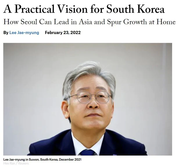 23일(현지 시각) 미 포린 어페어스 홈페이지 인터넷판에 실린 이재명 더불어민주당 대통령 후보의 기고문 제목. /포린어페어스 홈페이지