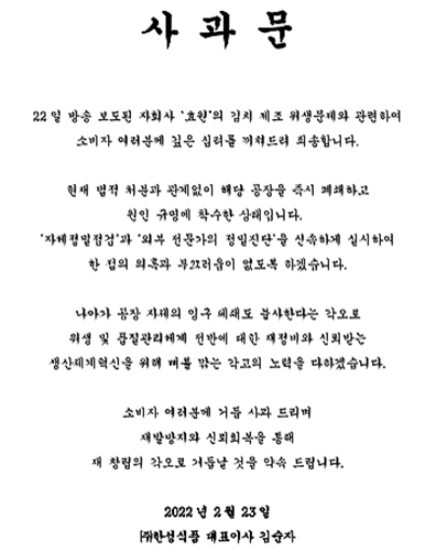 그는 “자회사 ‘효원’의 김치 제조 위생문제와 관련해 소비자 여러분께 깊은 심려를 끼쳐 죄송하다”며 “현재 법적 처분과 관계없이 해당 공장을 즉시 폐쇄하고 원인 규명에 착수한 상태”라고 밝혔다.