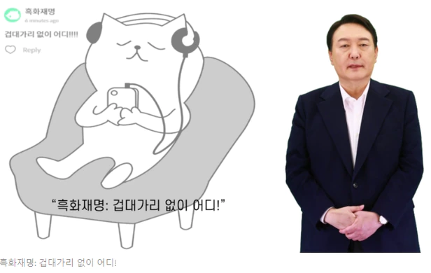 AI 윤석열은 이날 ‘윤석열 공약위키’ 사이트에 올린 동영상에서 “흑화재명님 댓글 감사합니다. 저한테 겁대가리가 없다니 이젠 무섭기까지 하네요”라고 했다. ‘흑화재명’은 이재명 후보를 빗댄 것으로 보인다.