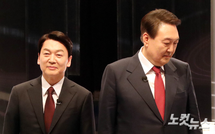 중앙선거방송토론위원회 주관으로 25일 오후 서울 상암 SBS 오라토리움에서 열린 제20대 대선 제2차 초청후보자토론회(정치분야)에서 국민의힘 윤석열 대선후보와 국민의당 안철수 대선후보가 인사를 마치고 각자의 자리로 향하고 있다. 윤창원 기자