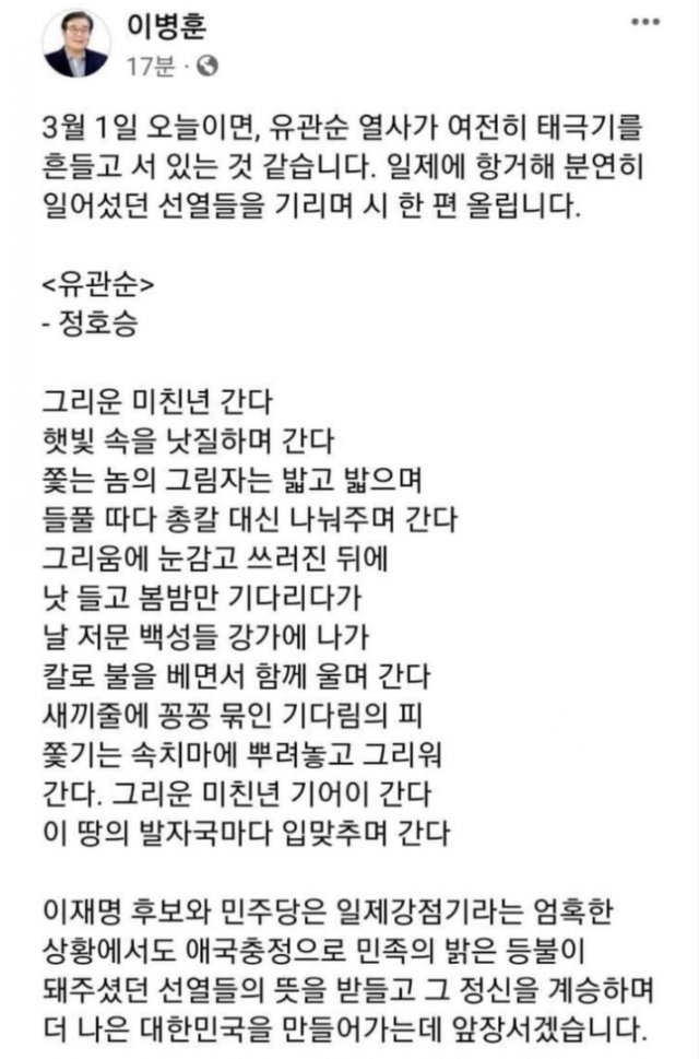 3.1절이 지나갔다. 아무것도 하지 않고 지나갔다. 무슨 의미인지 모를 정도로 지나갔는데, 더불어민주당의 이병훈 의원이 이런 시를 올려서 스스로 욕폭탄을 맞았다.