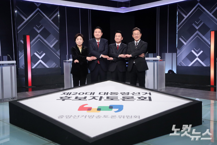 20대 대통령 선거가 일주일 앞으로 다가온 2일 서울 여의도 KBS에서 열린 중앙선거방송토론위원회 주관 제20대 대선 제3차 초청후보자 토론회에서 각 당 후보들이 토론회 시작에 앞서 기념촬영을 하고 있다. 윤창원 기자