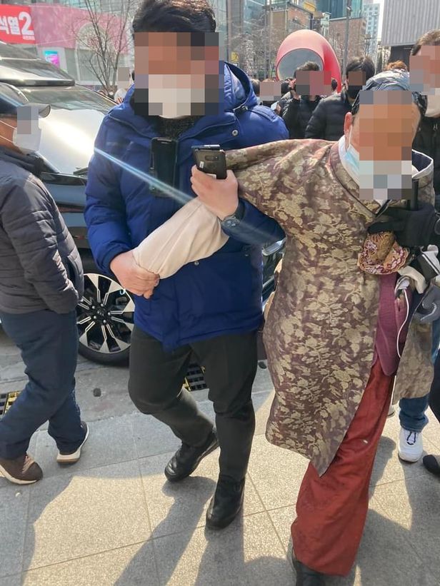 더불어민주당 관계자가 7일 서울 서대문구 신촌 선거 유세 현장에서 민주당 송영길 대표를 둔기로 공격한 가해자(오른쪽)를 끌고 가고 있다. 이 가해자는 '종전 선언을 지지한다'는 내용의 콘텐츠를 제작한 적이 있는 유튜버로 알려졌다. /독자 제공