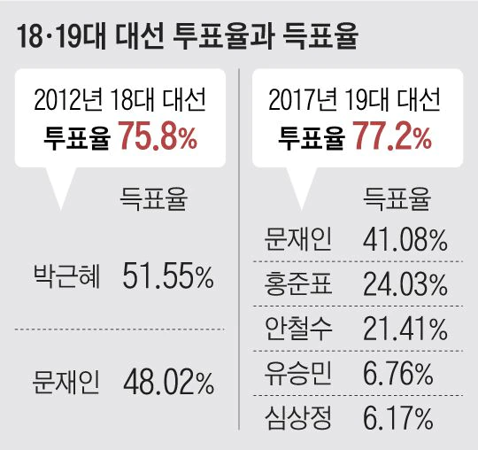 대통령 당선자가 과반 득표를 할지도 관전 포인트다. 1987년 대선 이후 과반 득표 당선자가 나온 건 2012년 대선 때가 유일하다. 사실상 제3당 후보 없이 치러진 2012년 대선에서 박근혜 새누리당 후보는 51.55% 득표율로 문재인 민주통합당 후보(48.02%)에게 승리했다.