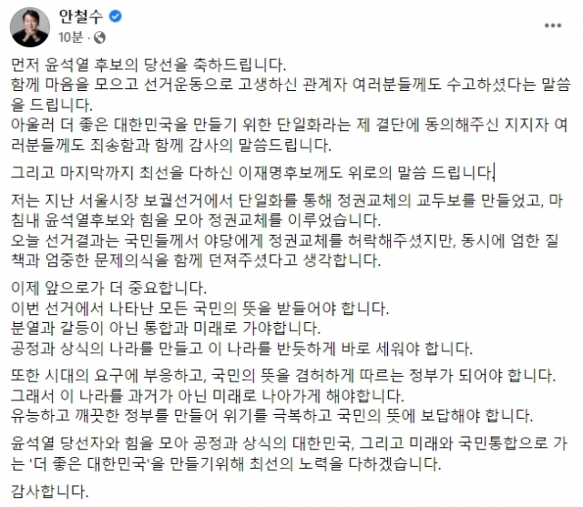 안 대표는 이날 새벽 페이스북에서 “먼저 윤석열 후보의 당선을 축하드린다”며 “아울러 더 좋은 대한민국을 만들기 위한 단일화라는 제 결단에 동의해주신 지지자 여러분들께도 죄송함과 함께 감사의 말씀드린다”고 말했다.