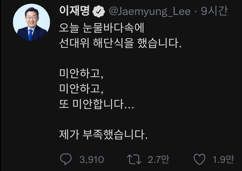 이재명 오늘 눈물바다속에 선대위 해단식을 했습니다. 미안하고, 미안하고, 또 미안합니다... 제가 부족했습니다.