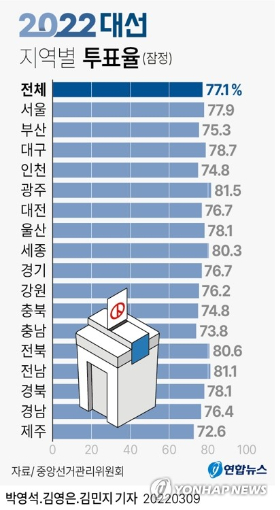 (서울 = 연합뉴스) 박영석 김영은 김민지 기자 = 제20대 대통령선거의 최종투표율이 77.1%로 잠정 집계됐다. 지난 2017년 19대 대선 최종투표율(77.2%)보다는 오히려 0.1%포인트 낮았다. zeroground@yna.co.kr 트위터 @yonhap_graphics 페이스북 tuney.kr/LeYN1 연합뉴스