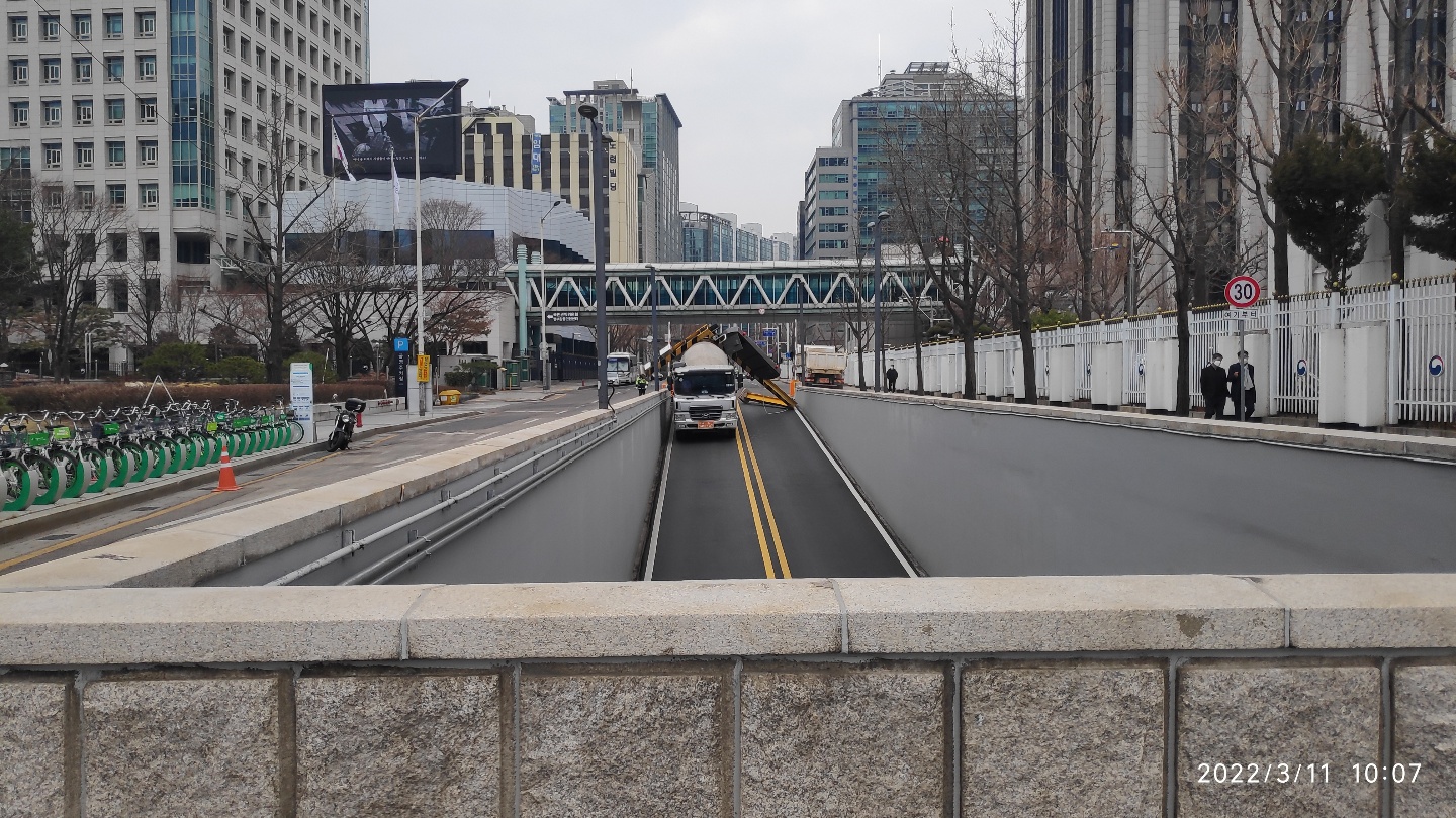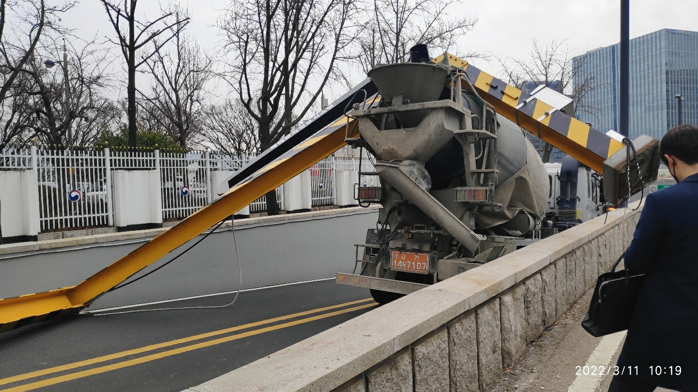 [현장 취재] 광화문 중앙지하보차도 시멘트 믹서 트럭 끼어 진입금지 H빔 뿌리째 뽑혀 높이 제한 위반 차량 무리하게 진입해 사고