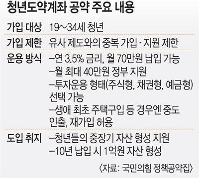 13일 윤 당선인 공약을 담은 국민의힘 정책공약집에 따르면 청년도약계좌는 윤 당선인의 주요 정책 금융 상품이다. 청년도약계좌는 만 19~34세 근로자 청년을 대상으로 한 저축 계좌를 가리킨다. 월 70만원까지 납입 가능하며, 금리 연 3.5%를 제공한다. 여기에 정부지원금 10만~40만원을 더해 10년 후 1억원의 자산을 만들어준다는 것이다.
