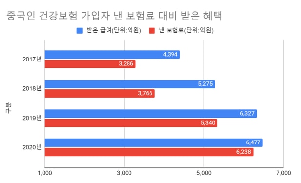 2017년 1108억원이었던 적자 폭은 2018년 1509억원으로 늘었다가 코로나19 확산으로 방문길이 막히자 2019년(987억원)과 2020년(104억원)에는 감소했다. 결과적으로 중국인 가입자들은 지난 4년 동안 1조8630억원을 보험료로 냈고, 건보공단이 이들의 치료비 등으로 2조2473억원의 급여비를 썼다.