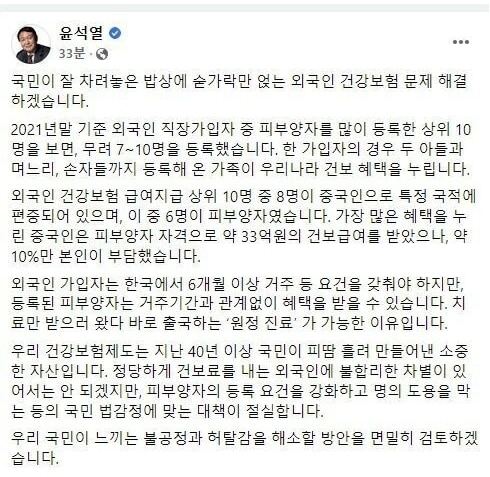 “국민이 잘 차려놓은 밥상에 숟가락만 얹는 외국인 건강보험 문제를 해결하겠다.” 윤석열 대통령 당선인이 지난 1월 30일 자신의 페이스북에 올린 글이다. 윤 후보는 “가장 많은 혜택을 누린 중국인은 약 33억원의 건보 급여를 받았으나 약 10%만 부담했다”고 밝혔는데, A씨가 바로 이 사례자다.