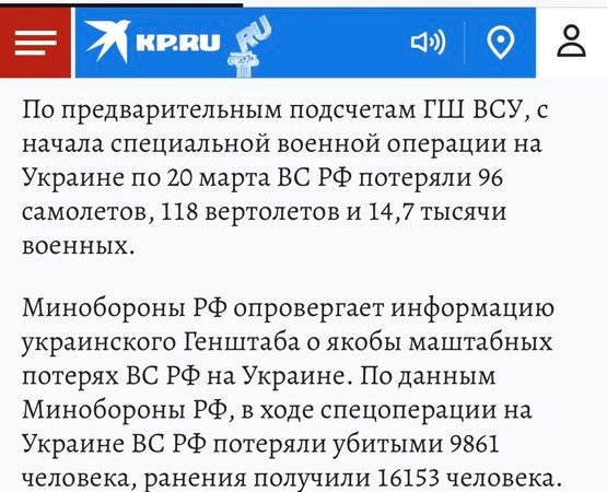 CNN에 따르면 러시아 매체 콤소몰스카야 프라브다는 모스크바 현지시간으로 20일 오전 12시 9분쯤 러시아 국방부를 인용해 “우크라이나에서 ‘특수 작전’이 이뤄진 이후 러시아군 9861명이 사망했고, 1만6153명이 부상했다”고 보도했다.