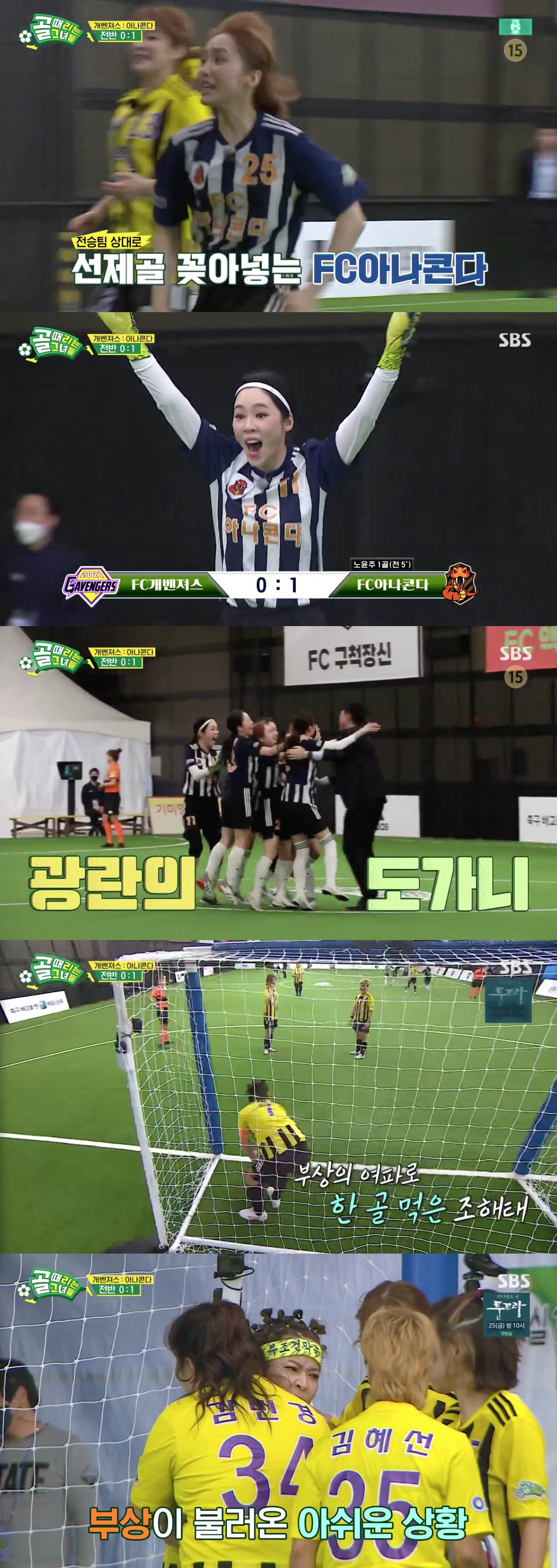노이어 노윤주가 선제골을 기록했다. 23일 방송된 SBS '골 때리는 그녀들'(이하 '골때녀')에서는 FC아나콘다와 FC개벤져스의 리그전이 펼쳐졌다.