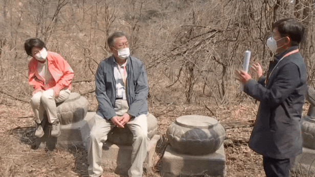 문재인 대통령과 김정숙 여사가 5일 오후 북악산 남측 탐방로의 절 터(법흥사터 추정)를 찾아 초석에 앉아서 김현모 문화재청장의 설명을 듣고 있다.