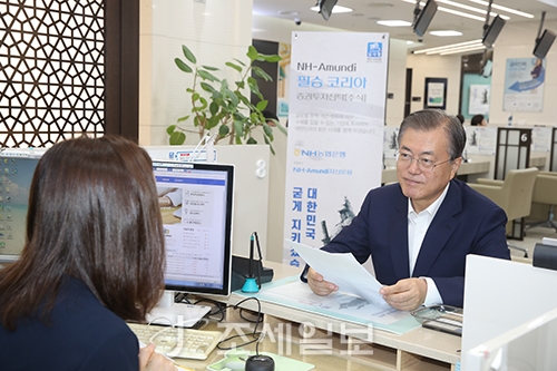 문재인 대통령이 26일 서울 중구 농협은행 본점에서 NH-Amundi 필승코리아 펀드에 가입하고 있다. 사진=농협금융지주 제공