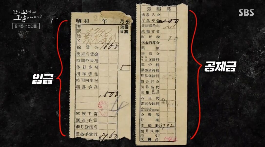 훗카이도 탄광에 끌려갔던 한 조선인의 급여명세서가 공개됐어. 급여는 임금과 공제금으로 나뉘어 있는데, 임금이 총 31원 60전인 반면 공제금은 37원 2전이었어. 임금에서 공제금을 빼면 마이너스, 일을 할수록 빚이 더 늘어나는 구조야. 강제노역에 다녀오신 분들 중에 월급을 제대로 받았단 분들이 거의 없어.