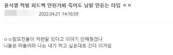 이런 가운데 윤 당선인의 이른바 ‘쩍벌’(다리를 쩍 벌리고 앉음) 논란이 대선 이후 오랜만에 다시 여론의 도마에 올랐다. 윤 당선인 지지층으로부터도 부정적 반응이 나왔다. 한때 대선 리스크로까지 부각됐던 쩍벌을 또 다시 보여준 것은 주위 의견을 아예 경청하지 않는 것 아니냔 지적이었다.