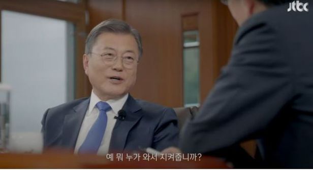 문재인 대통령은 지난 14~15일 손석희 전 JTBC 앵커와 퇴임 전 마지막 인터뷰를 가졌다. 25일 방송을 앞두고 JTBC는 22일 5편의 예고 영상을 공개했는데, 이 중 여권 커뮤니티에서 가장 큰 화제를 모은 건 “’문 대통령 지키기’ 논쟁에 관하여”라는 제목의 예고 영상이다.