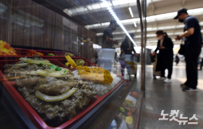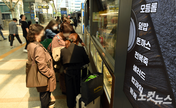 코로나19로 인한 사회적 거리두기가 전면 해제된 가운데 오는 25일부터 영화관, 실내스포츠 관람장은 물론 대중교통에서도 음식물을 먹을 수 있게 됐다. 이에 따라 팝콘을 먹으면서 영화관람이 가능하고, 돔구장에서 '치맥(치킨과 맥주)'이 가능해진다. 다만 시내·마을버스의 경우 코로나19 사태 이전에도 음식물 반입 등을 제한하는 지방자치단체가 있었던 만큼, 실내 취식 금지 조치가 유지된다. 사진은 24일 서울역 도시락 코너의 모습. 황진환 기자