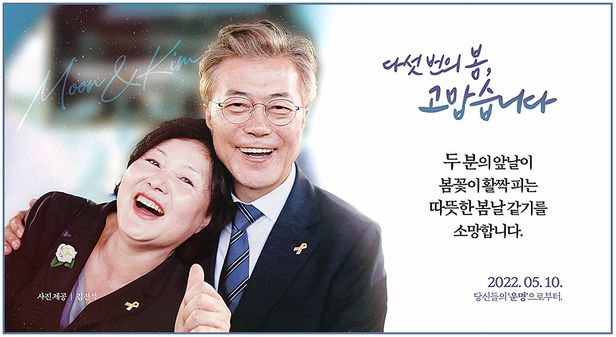 이에 따르면 이번 광고는 강남역 11번 출구 규정빌딩에서 28일부터 5월 12일까지, 광화문 경복궁역 6번 출구 적선현대빌딩에서 28일부터 5월 27일까지 진행된다. 문 대통령과 김정숙 여사가 활짝 웃는 사진 옆으로 “다섯 번의 봄, 고맙습니다” “두 분의 앞날이 봄꽃이 활짝 피는 따뜻한 봄날 같기를 소망합니다” “두 분과 함께여서 행복했습니다” 등의 문구가 적혀있다. 아래쪽에는 작은 글씨로 “당신들의 ‘운명’으로부터”라고 쓰였다.