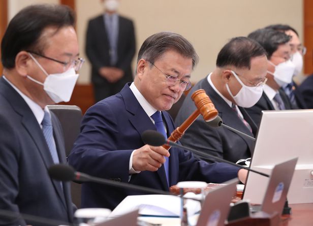국무회의서 검수완박 법안 땅땅 - 문재인 대통령이 3일 청와대에서 주재한 국무회의에서 의사봉을 두드리고 있다. 문 대통령은 이날 이른바 ‘검수완박(검찰 수사권 완전 박탈)’ 법안이라 불리는 검찰청법과 형사소송법 일부개정법률안을 의결하며 “역사적·시대적 소명에 부합하는 정책 방향”이라고 했다. /뉴시스