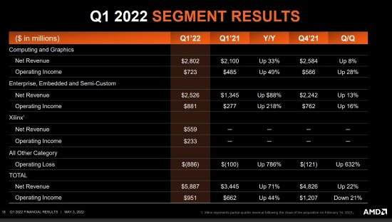 리사 수 AMD 최고경영자(CEO)는 “1분기는 역대 분기 최대 매출액 기록을 경신하고 자일링스 M&A를 마무리하는 등 AMD 미래를 향한 중요한 변곡점이었다”이라며 “3분기 연속 서버용 CPU 매출액은 2배 이상 성장했다”라고 말했다.