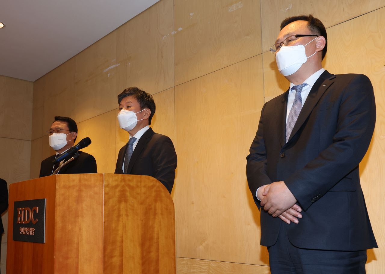 4일 오전 서울 용산 아이파크몰에서 열린 광주 화정동 아이파크 사고 수습 관련 대책 발표 기자회견에서 정몽규(가운데) HDC그룹 회장이 발언하고 있다./연합뉴스