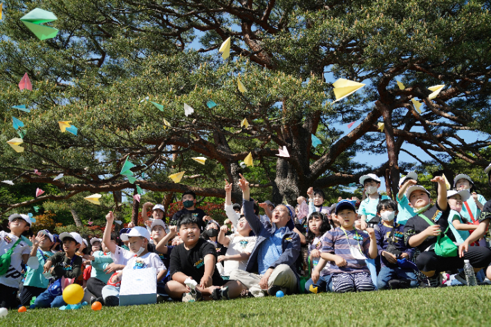 어린이들과 종이비행기 날리는 문재인 대통령 내외. 연합뉴스