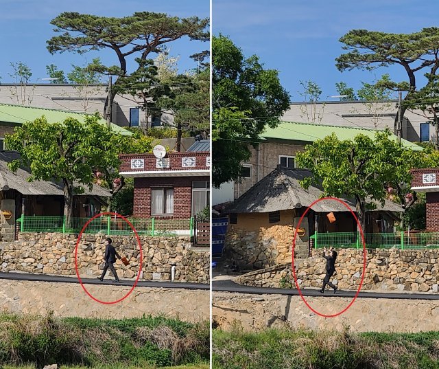 공개된 사진에는 사저 앞에서 퇴근하는 탁 전 비서관의 모습이 담겼다. 탁 전 비서관은 들고 있던 갈색 서류 가방을 갑자기 하늘로 휙 던지더니 두 손으로 받았다. 그리고는 문 전 대통령 지지자들을 향해 손을 흔들었다.