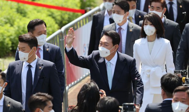 윤석열 대통령이 10일 서울 여의도 국회의사당 앞 잔디마당에서 열린 제20대 대통령 취임식에 부인 김건희 여사와 입장하고 있다. /국회사진기자단