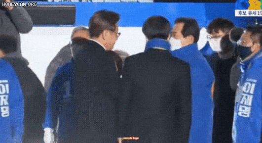 3월 8일 서울 광화문 청계광장에서 열린 '국민의 꿈이 이재명의 꿈입니다' 서울 집중 대선 유세에서 이재명 민주당 고문이 김동연 경기지사 후보를 손으로 미는 모습/이재명 유튜브
