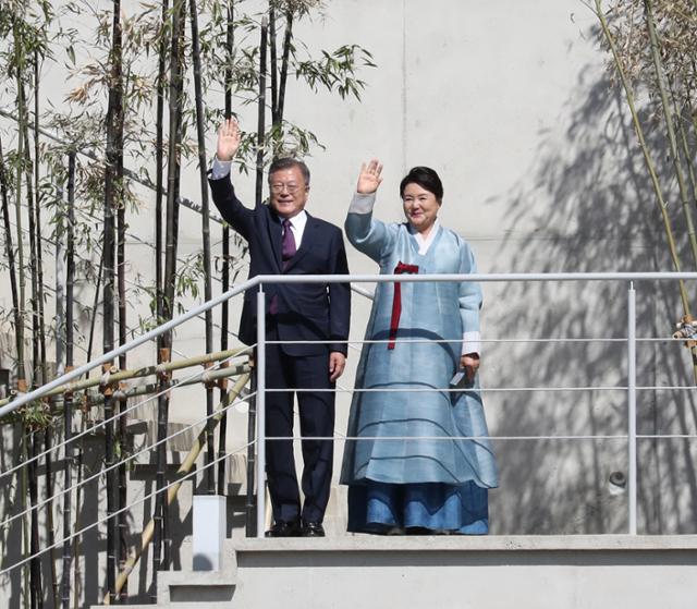 문재인 전 대통령과 김정숙 여사가 10일 경남 양산 평산마을 사저로 들어서며 환영하는 시민들을 향해 손을 흔들고 있다. 양산=청와대사진기자단