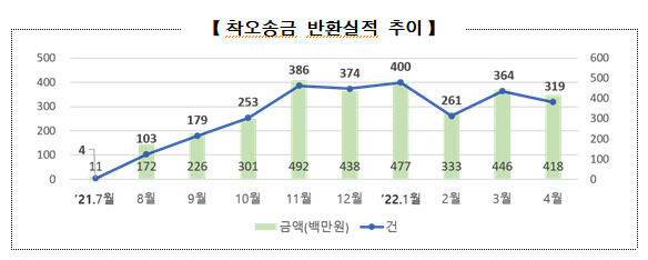 예보는 11일 “제도가 본격적으로 시행된 지난해 8월 이후 지원신청이 월평균 931건(13억6000만원)으로 안정적으로 운영되고 있다”면서 이같은 내용의 ‘착오송금 반환지원제도 현황’을 공개했다.