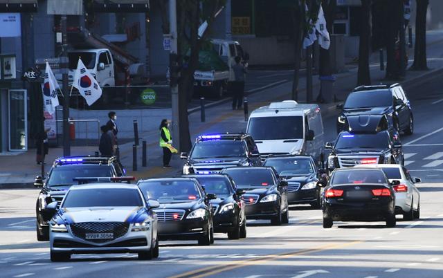 11일 사저에서 첫 출근길에 나선 윤석열 대통령이 탄 차량이 서울 서초구 삼호가든 사거리 인근을 지나가고 있다. 고영권 기자