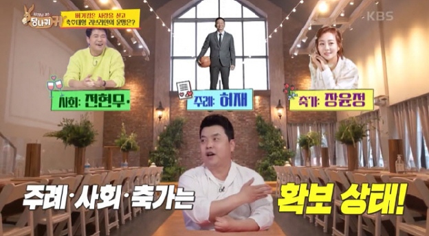 앞서 정호영은 지난 방송에서 직원 김과장이 제주에서 터를 잡도록 웨딩 플래너 역할을 자처, 결혼식 날짜는 물론 웨딩홀 예약까지 잡았다. 김과장은 아직 여자친구에게 청혼을 하지 않는 상황, 김숙과 이대형이 예식장을 가로챌지 기대감이 커진다. 결혼식 사회는 전현무, 축가는 장윤정, 주례는 허재가 맡는 것으로 알려졌다.