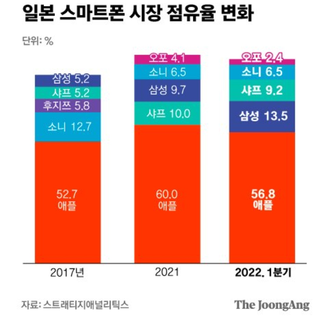 2017년부터 지난해까지 최근 5년 동안 삼성전자의 연간 시장점유율을 보면 2017년 5.2%였다가 6.4%(2018년), 7.8%(19년), 10.1%(20년)로 점차 오른 뒤 지난해 9.7%로 소폭 하락했다. 같은 기간 애플과 샤프의 점유율은 각각 52.7→60%, 5.2→10%로 뛰었다. 소니는 12.7%에서 6.5%로 반 토막 났다. 중국 브랜드는 화웨이가 2018년 5.2%에서 지난해 0%대로 떨어지는 대신 존재감이 없던 오포가 4.1%를 기록하며 두각을 드러냈다.