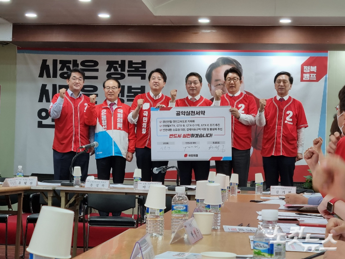 19일 국민의힘 당 지도부가 유정복 인천시장 후보 캠프에 모여 중앙선거대책위원회 현장회의를 진행했다. 정성욱 기자