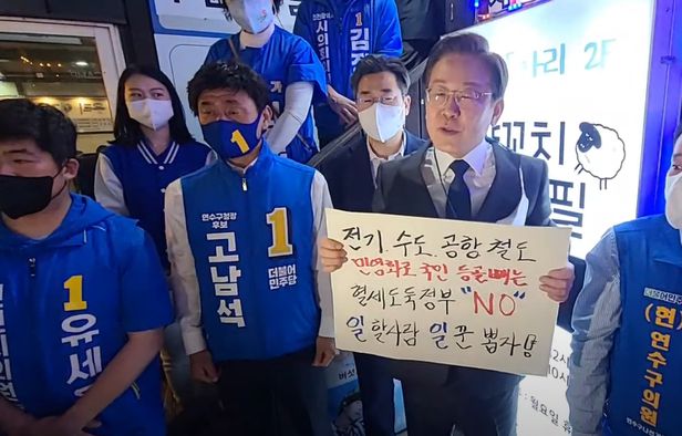 인천 계양을 보궐선거에 출마한 이재명 더불어민주당 후보가 18일 오후 인천 연수구에서 '전기 ,수도, 공항 ,철도 민영화 반대' 피켓 들고 지원유세를 하고 있다./유튜브 황기자TV