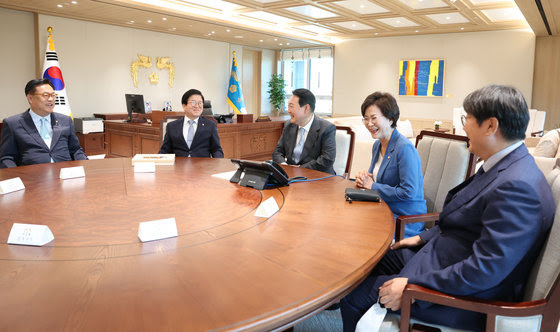 윤석열 대통령이 24일 용산 대통령실 청사 집무실에서 박병석 국회의장을 비롯한 의장단을 접견하고 있다. 사진 왼쪽부터 정진석 부의장, 박 의장, 윤 대통령, 김상희 부의장, 이춘석 사무총장. 대통령실 제공