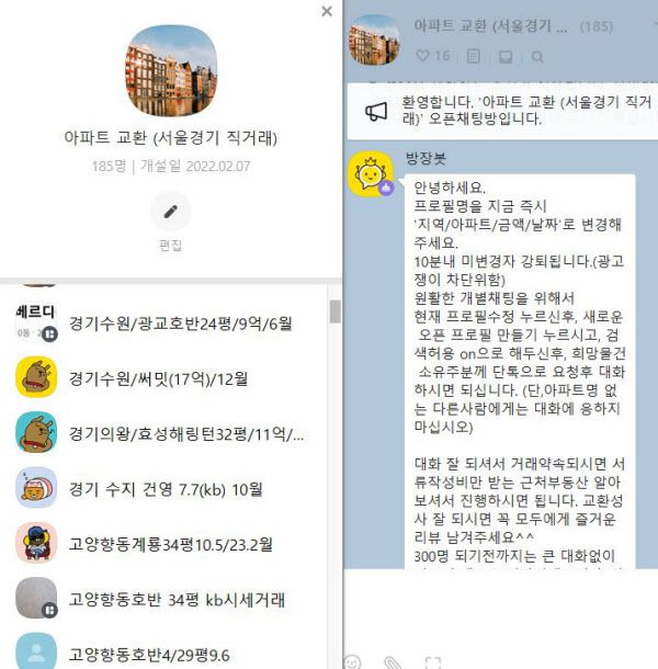 [땅집고] 아파트 교환 거래를 목적으로 한 카카오톡 오픈 채팅방. 일시적 1가구 2주택자 중심으로 교환 거래가 늘어나고 있다. /전현희 기자