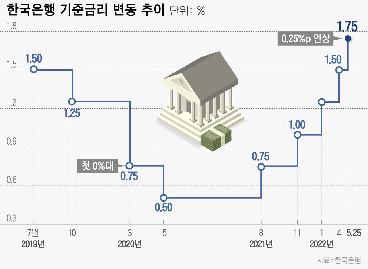 한국은행이 기준금리를 연 1.75%로 0.25%포인트(p) 인상했다. 치솟는 물가를 잡고, 미국 중앙은행(Fed)의 공격적인 긴축 행보에 발맞춰 한 달 만에 추가 인상을 결정한 것으로 풀이된다.