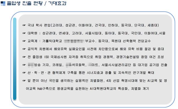 A씨가 건넨 NWSSU 한글 소개서에 따르면 NWSSU 졸업생은 현재 한국 사회 여러 분야에 포진해 있었다. 소개서에는 ‘서울시의원을 2번 하고 ○○○구청장에 출마한 B씨 등 정계뿐만 아니라 C방송사 기자 등 언론계, D석유화학·E마트·코레일·서울시시설관리공단 등 산업계에도 NWSSU 출신이 있으며, 가톨릭대 이모 교수, 동국대·목원대 산학협력 전담교수 등 학계에도 NWSSU 출신이 많다’는 취지의 소개 글이 적혀 있었다.