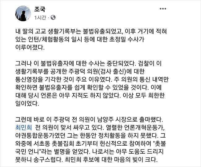 앞서 조 전 장관은 이날 오전 자신의 페이스북에 최 후보를 언급하며 “열렬한 언론개혁 운동가이자 야권 통합 운동가였던 그(최 후보)는 한동안 정치활동을 하지 못했다”며 “그 와중에 서초동 촛불집회 초기부터 헌신적으로 참여해서 ‘촛불 국민 언니’라는 별명을 얻었다”고 썼다. 이어 “나로서는 아무 도움도 드리지 못하니 송구스럽다”며 “최민희 후보에 대한 마음의 빚이 크다”고 밝혔다.