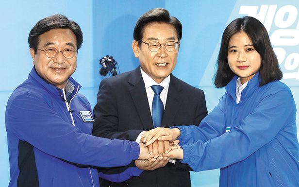 이재명, 선거사무실서 윤호중·박지현 만나 - 더불어민주당 이재명(가운데) 후보가 30일 자신의 인천 계양을 선거사무실에서 윤호중(왼쪽)·박지현 공동비대위원장과 손을 맞잡고 있다. /국회사진기자단