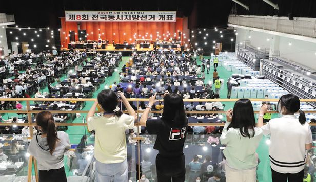 개표 지켜보는 아이들 - 1일 6·1 지방선거 및 국회의원 보궐선거 개표소가 설치된 서울 성남고등학교 체육관에서 어린이들이 개표 현장을 지켜보고 있다. /오종찬 기자