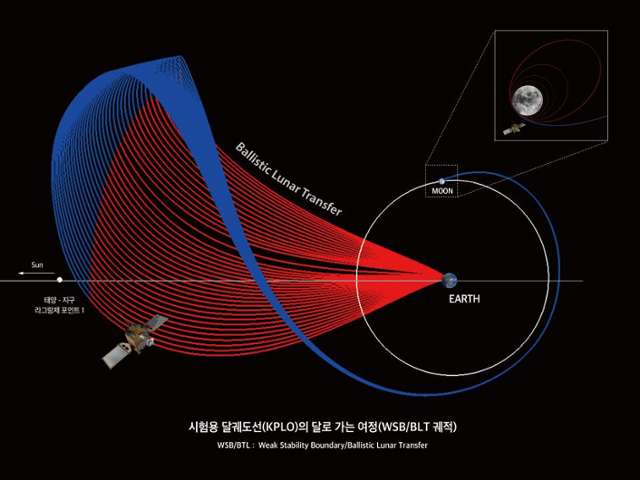 다누리는 달에 가기 위해 다소 특이한 방법을 택했다. 시간은 가장 오래 걸리지만 연료를 최소한으로 사용할 수 있는 '탄도형 달 전이 방식(BLT)' 궤적을 따르기로 했다. 김대관 항우연 달탐사사업단장은 "천체 사이의 '중력장 고속도로'를 타는 방식"이라며 "이 방법을 이용하면 궤도 진입 시 감속량이 크지 않아 결과적으로 연료를 아낄 수 있게 된다"고 설명했다. 연료의 70% 이상이 달에 진입할 때 사용된다는 점을 감안하면, 적은 연료로 더 많은 탑재체를 싣고 임무를 연장할 수 있게 된다는 뜻이다. 우리나라로서는 달까지의 거리(38만4,000㎞)보다 훨씬 먼 156만㎞까지 갔다가 돌아오는 심우주 항행을 해볼 수 있는 좋은 기회이기도 하다.