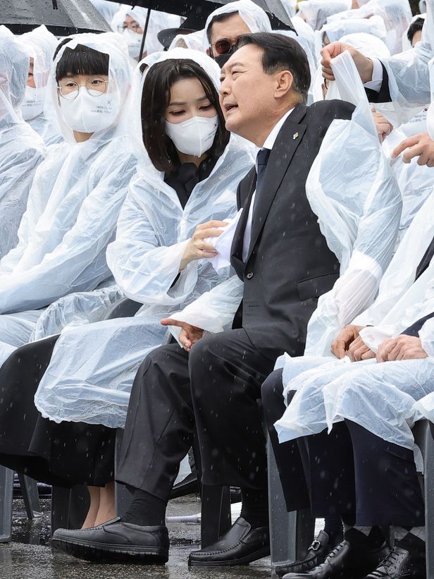 尹대통령 빗물 닦아준 김건희 여사… 우의 입고 현충일 추념식 참석