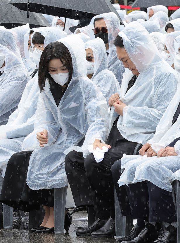 제67회 현충일 추념식은 장대비가 쏟아지는 가운데 동작구 국립서울현충원에서 치러졌다. 윤 대통령 내외는 이날 흰색 비닐 우의를 입고 참석해 나란히 앉았다. 김 여사는 추념식 동안 윤 대통령의 옆에서 연신 옷에 묻은 빗물을 수건으로 닦아냈다.