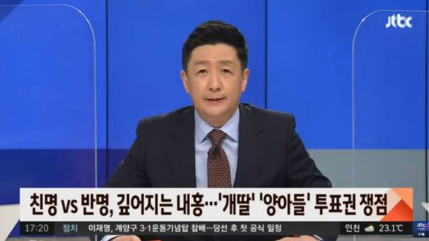 문제의 ‘양아치’ 발언은 6일 오후에 방송된 JTBC ‘정치부회의’에서 나왔다. 이상복 기자는 “오늘 발제는 이렇게 정리하겠다. 친명 대 반명, 전당대회 앞두고 깊어지는 민주당 내홍. ‘개딸’ ‘양아치들’”이라고 했다. 이 기자는 곧바로 “양아들”이라고 바로잡은 뒤 “투표권 쟁점으로 제목을 잡겠습니다”라고 했다.