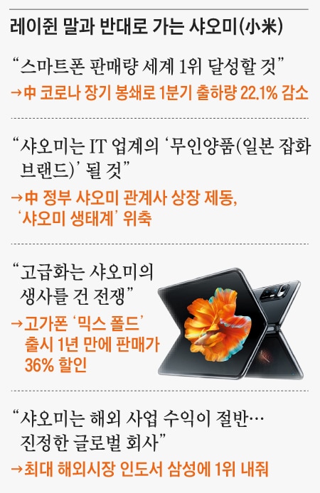 샤오미가 꿈꿔왔던 고급화 전략, 이른바 ‘중국판 애플’이 되겠단 목표도 실현이 쉽지 않은 상황이다. ‘80% 사용자의 80% 수요 충족’으로 대표됐던 가성비 전략을 뒤엎는 것이 자국에서조차 호응을 얻지 못하고 있는 것이다. 가격 50만원 이상의 중국 고급폰 시장에서 샤오미의 점유율은 5%로, 애플(60%)은 물론 중국 제조사인 화웨이(11%)·비보(9%)·오포(7%)보다 낮다. 샤오미가 지난해 내놓은 첫 폴더블폰 ‘미 믹스폴드’ 역시 판매 부진이 이어지면서 최근 공식 판매가를 1만999위안(약 207만원)에서 6999위안으로 대폭 낮췄다.